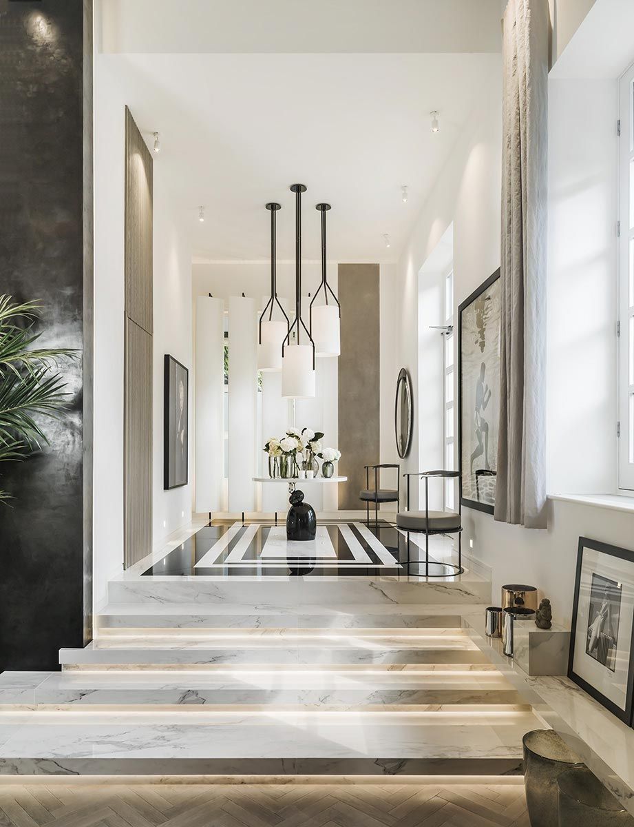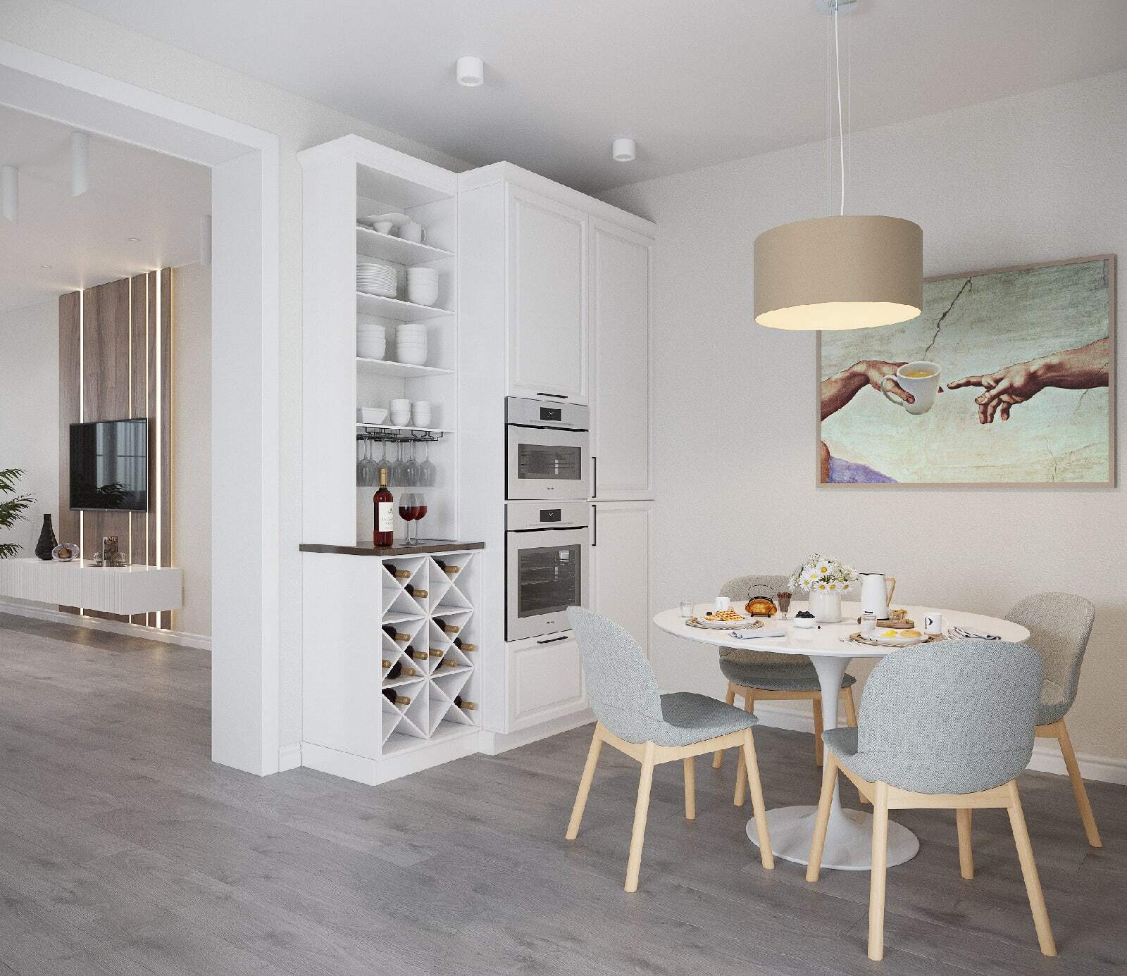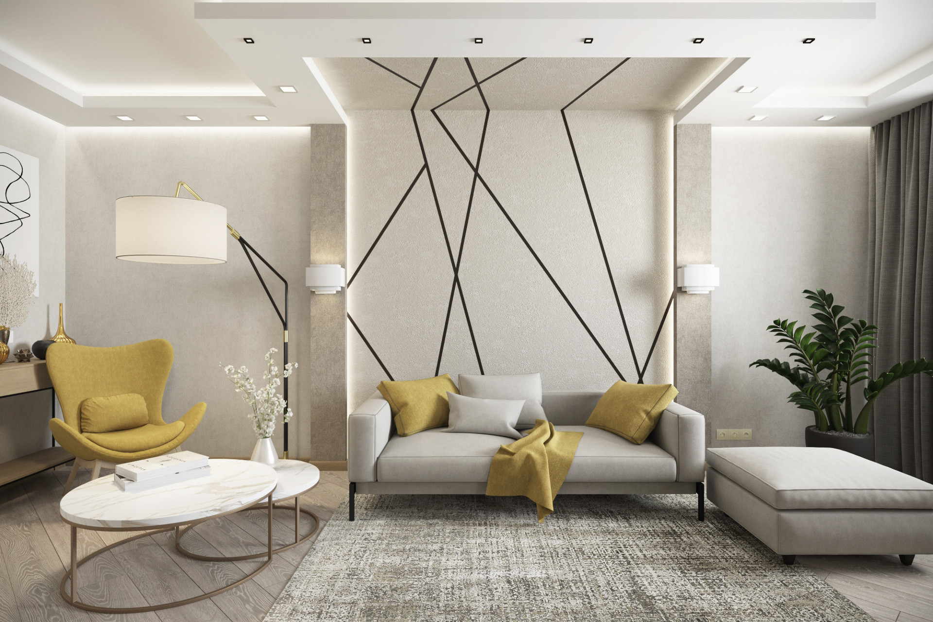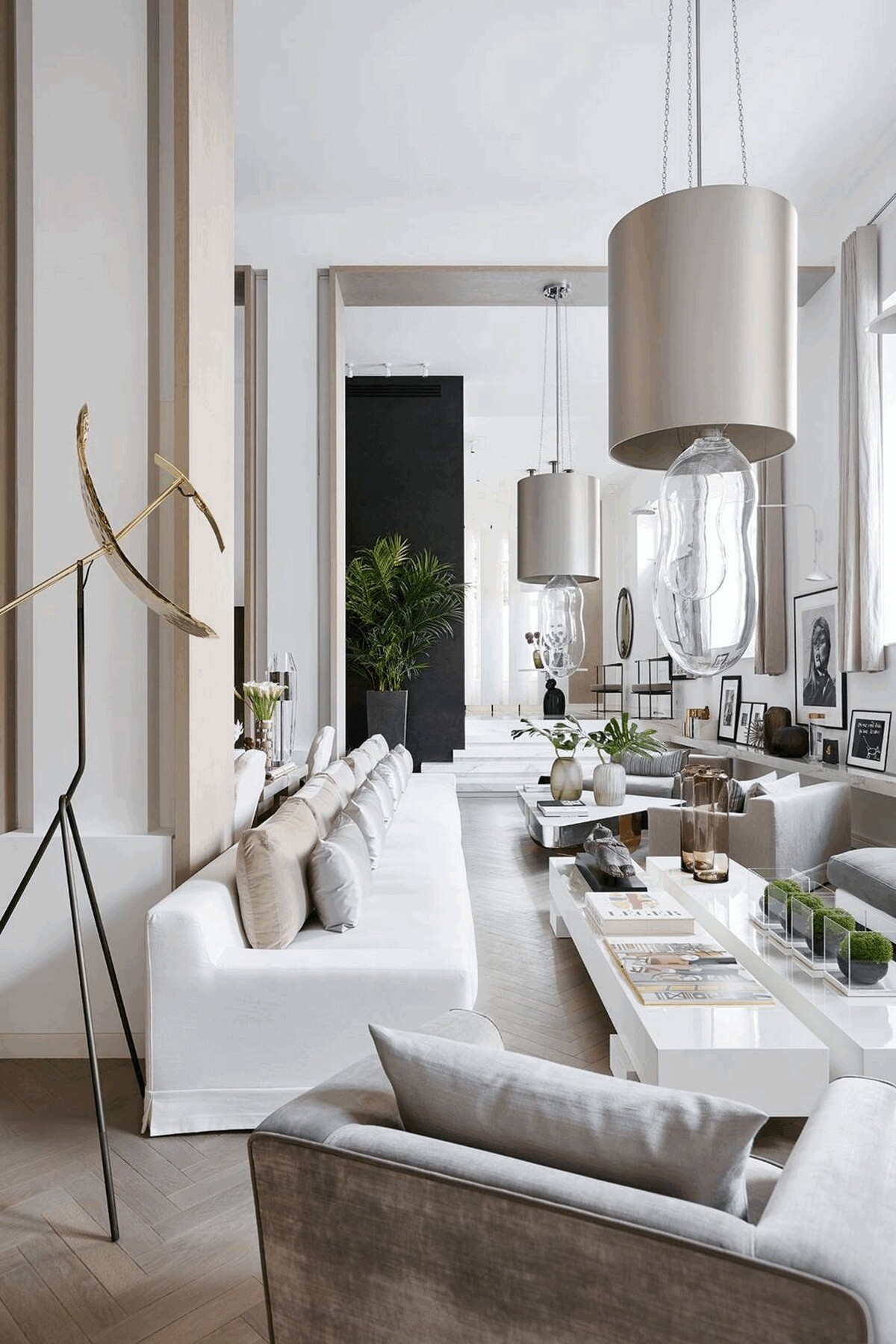Цветовую гамму всегда нужно обсуждать не саму по себе, а в контексте пространства, декора, мебели. Например, проекте бело-серого интерьера квартиры сбалансировано сочетаются разные по насыщенности глянцевые фасады, обивка диванов и стульев, шторы, матовая отделка стен, и на их фоне привлекают внимание мягкая желтая подсветка, конструкция потолков, черные стильные светильники, живые растения.