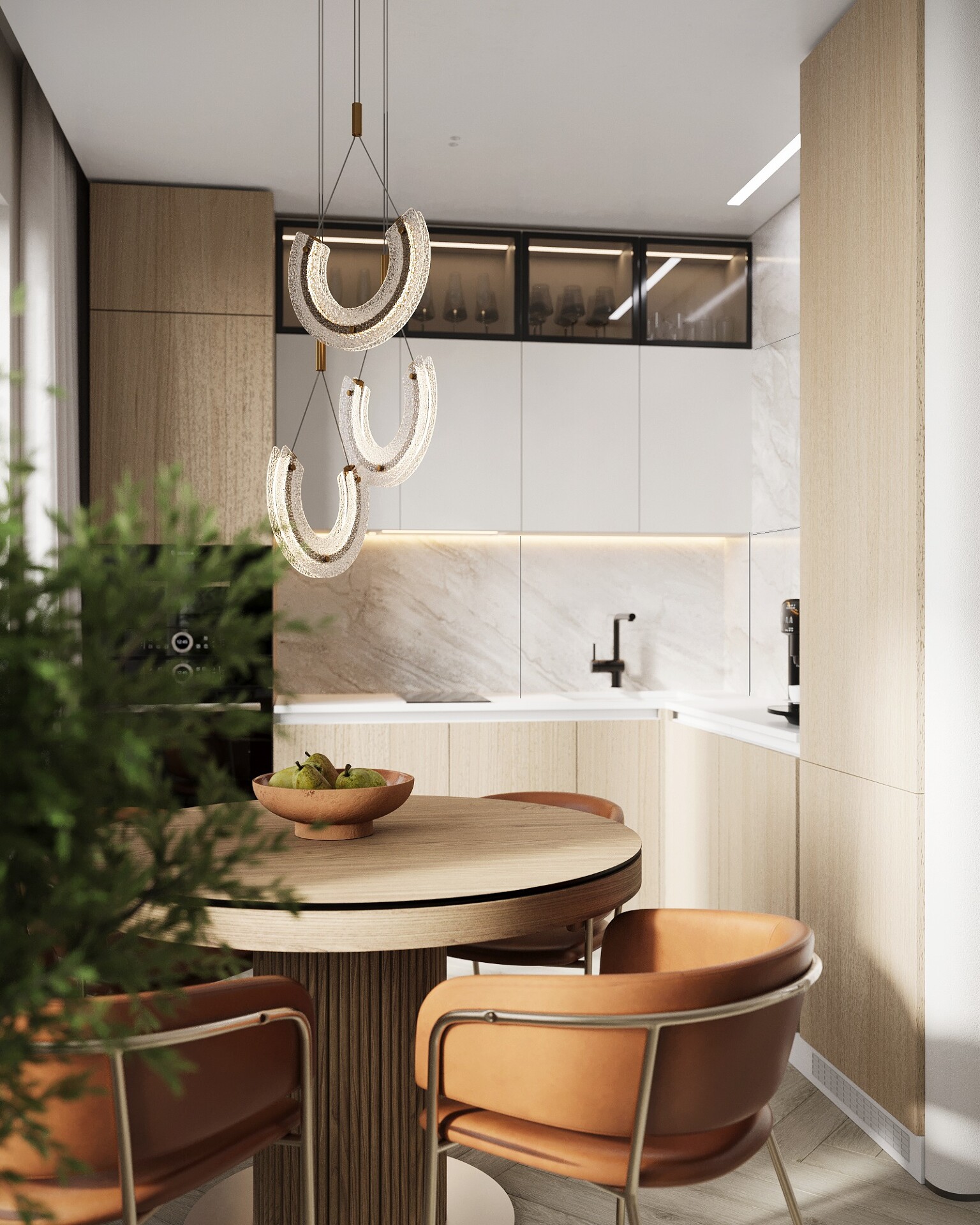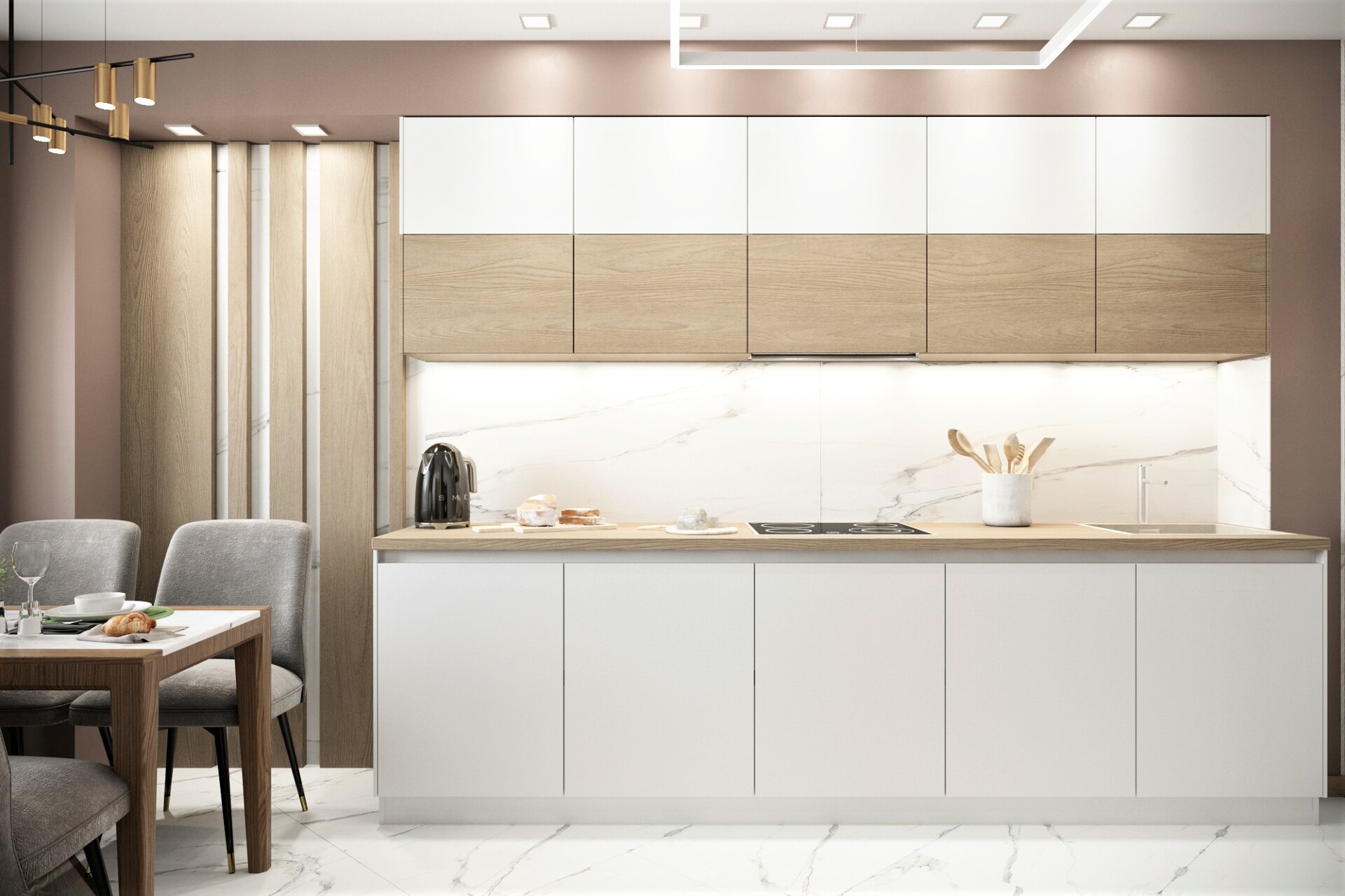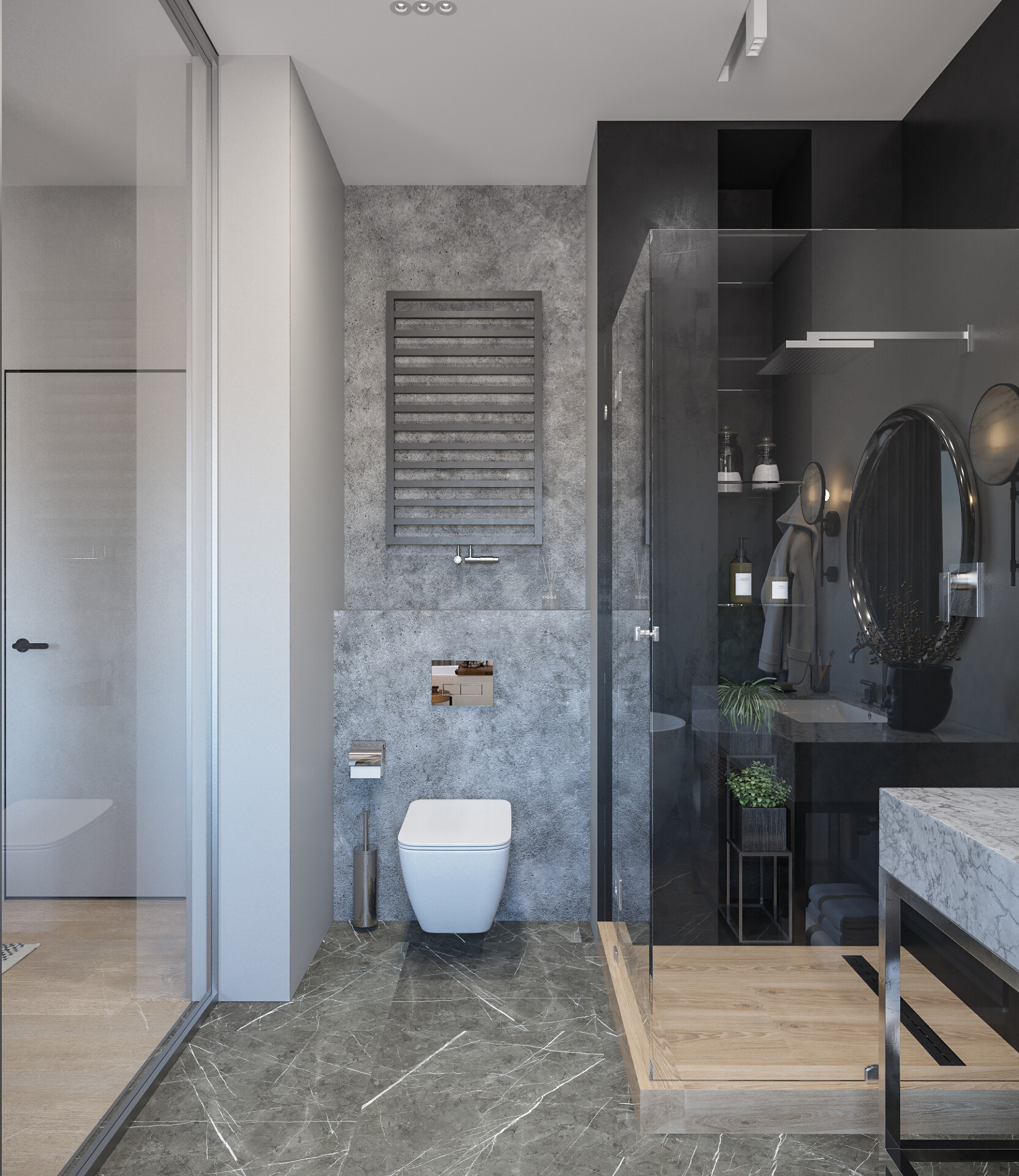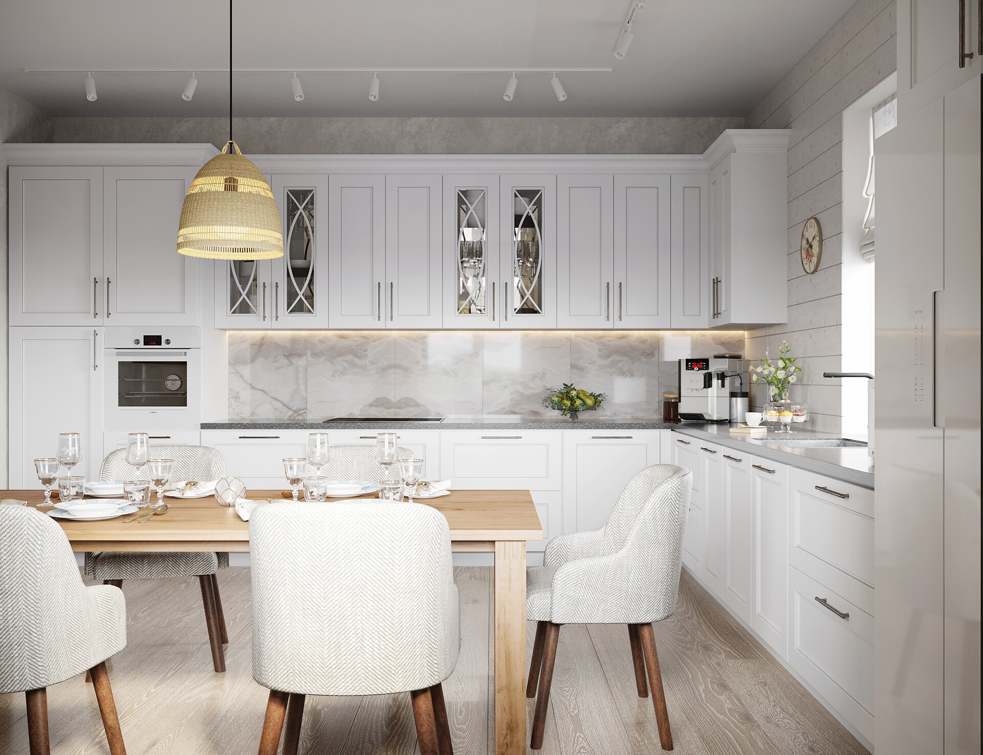 Цветовую гамму всегда нужно обсуждать не саму по себе, а в контексте пространства, декора, мебели. Например, проекте бело-серого интерьера квартиры сбалансировано сочетаются разные по насыщенности глянцевые фасады, обивка диванов и стульев, шторы, матовая отделка стен, и на их фоне привлекают внимание мягкая желтая подсветка, конструкция потолков, черные стильные светильники, живые растения.